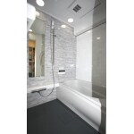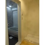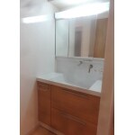 ユニットバスはTOTO・WGシリーズで1サイズアップ。 シャワー高さを調整できるスライドバーと換気暖房乾燥機を設置。 また、浴室横の洗濯パンは、マンションで定期的に行う排水管清掃の際、重い洗濯機を動かさずに高圧洗浄が出来るよう、排水穴が手前にある洗濯パンを設置しました。