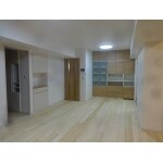 旧個室④の間仕切り壁を開口しリビングと繋げることを提案し、広々としたLDK空間へ。 床はマンション規約の遮音等級LL-40を満たす為に、躯体から音や振動が伝わるのを軽減させるゴム付の際根太(キワネダ)と、LL-40等級を満たすフリーフロアを使い段差解消の床上げを行い、お施主様ご希望の桐フローリングで仕上げました。