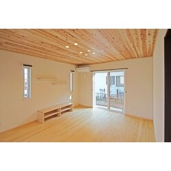 天井と床に無垢材を使用したので、素足で歩いても気持ちよく、床に寝ころびたくなるリビングです。テレビボードはソファーに座った時にちょうど良い高さで設計製作しました。