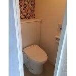 トイレの後ろの壁にはポップなタイル調でアクセントとなるよう仕上げました。以前あったタンクがなくなりスッキリ明るいトイレへと変わりました。