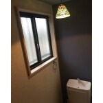 青のクロスがアクセントになりおしゃれなトイレ空間。またポイントとなる照明が優しく空間に光をさしてくれます。