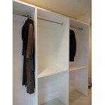 今回洋室・納戸・廊下の3箇所に完全オーダーの収納を造作しました。 洋室には両左右にW2400・W3300の洋服収納を造作。 お持ちの洋服をまとめてスッキリと収納できるようになりました。 納戸にはL型の収納棚を、広々とした廊下には通行の邪魔にならない範囲でW2810の収納を造作。 ご旅行や出張の際使うキャリーケースを置くため、下のほうはスペースを空けて造作しました。