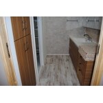 化粧台そのものは再利用しサイドに引き出しキャビネットとフラップ収納を追加。その扉の面材に合わせ既存の扉等をシート張替え、鏡の所は引き出し収納の天板一体でモザイクタイルを貼付け。床は凹凸が少しある長尺シートでよりリアルで丈夫なシートに張り替えました。