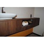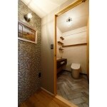 手洗い付きカウンターの上部に来客用の手拭きペーパー、タオルバー、鏡などを設置。 少しゆっくりくつろげる空間を演出。