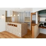 キッチンをL型から対面へ変更しキッチン奥にパントリーを設ける。腰壁を造作しタイルで巻く。リビングの中で存在感を示しつつ、使い勝手を優先し清掃性の良いフード、シンクを使用しました。