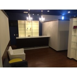 接客スペース完成 床に落ち着いた木目のエンビタイルを使い、高めの壁には明るい色のクロスで圧迫感が出ないよう注意しました。カウンターのバックには商品棚を取り付け、受付しながら商品の説明も出来るレイアウトとしました。