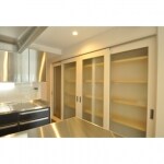 壁一面に収納棚を造作し、収納力不足を解消!また、クリアパネル建材にすることで、清潔感を。キッチンの面材にもオールステンレスにすることで清潔感をより一層強調。