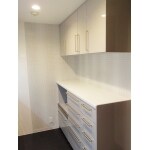 YAMAHA Berry W2550 にお取替え。 カウンターはニューグラーナホワイト、扉の面材は絹鼠(きぬねず)をお選び頂きました。 ピアノ塗装の技術が活かされた非常に美しい塗装仕上げの扉です。