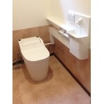 清掃のしやすいタンクレス式便器に。床面をクッションフロアにして温かみを。