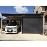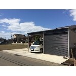 お庭の目隠しも兼ねた位置に設置しました。 また前面道路がすれ違うには狭い道路にもかかわらず、交通量が多かったので、あえて2m程度スペースを設けてから車庫を配置しました。