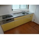 本体を撤去し、タイルの壁もキッチンパネルを貼り直し、明るいイエローのキッチンを設置しました。 収納も引出し式なので細かくキッチン用品が収納できます。