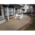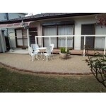 弊社からは、単純なコンクリートでは面白くないので、フロアビーズを敷き詰め、レンガで縁取りするご提案を致しました。 舗装などとは違い直射日光の照り返しが無く、快適にお茶が楽しめる素敵なデッキが完成しました。