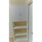 靴箱を移動して、カップボードを造作し設置しました。上部は観音開きの収納で、下部は電子レンジや炊飯器等の家電のサイズに合わせて棚にしています。