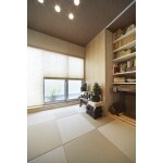 今回の全面リフォームで浴室と洗面室を2階に移設したため、和室の広さを少しコンパクトにしました。 以前は土壁で老朽化していましたが、内装も全て一新して美しくなりました。 畳は半帖畳を市松模様に貼り、天井には麻の織物調クロスを貼りました。さらにダウンライトを設置してモダンな空間を演出しています。 入口部分に設置したスリット格子が光を通し、廊下も明るい空間に変わりました。 来客時にお仏壇を隠せるように、可動間仕切り収納を取り付けました。 本やミシンなどが置けるよう棚を造作し、隠せる収納ですっきりとした空間になりました。 大きな窓から廊下まで明るい光が差し込む、モダンな和室に生まれ変わりました。