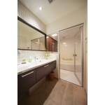 洗濯機と浴室を1ヶ所にまとめることが出来たため、生活動線が改善され、お洗濯がしやすくなりました。 壁面にはデザイン性のあるタイルを貼り、ホテルのサニタリールームのような高級感が生まれました。