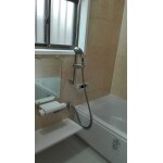 扉はアルミ額縁の片開き扉へ変更しました。浴室のデザインに合うとても明るい印象になりました。折戸に比べ、隙間が少ないので防カビ対策にもなり、お手入れがしやすくなりました。また、開閉も楽になりました。