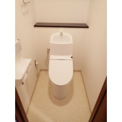 既存はC730B/S730Bという品番のトイレがついていました。 今回、TOTO GG-800にお取替え。 合わせて内装工事も行い、明るい印象になりました。 TOTO GG-800のおすすめポイントをご紹介します。 ●手洗いがしやすい高さ お子様からお年寄りまで、みんなが使いやすい高さ800mmの手洗いボウル部分。 背の高い方も低い方も、ラクな姿勢で手洗いすることができます。 ●深ひろボウル しっかり手を洗っても、手が当たることがありません。水切り動作をしてもまわりに水はねしにくい、大きく口を開いた形状です。 ●停電時安心設計 便器に向かって右横奥の手動レバーを引っ張ることで停電時も水を流せます。 ●便器との間をサッとお掃除『お掃除リフト』 サイドのレバーを引き出して回すと、ウォシュレットの前方が持ち上がる便利なリフト機構。ウォシュレットの本体と便器部の間をラクにお掃除できます。