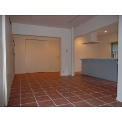 床防音を施した下地をつくり、寝室・水回り以外をテラコッタタイル敷設とした。寝室は無垢パイン材フローリング鮮やかなブルーのクロス仕上げ、キッチンは造作とした。