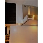 壁をふかし、3枚扉の吊戸棚を取付ました。天井にあったダウンライトを吊戸棚とレンジフードの間に移設し、明かりを減らすことなく、ご希望を叶えることができました。