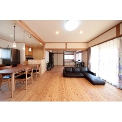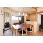 床を県産材の唐松にし、あたたかみある空間になりました。 下がり壁などで取り払えるものは取り壊すことで、広く感じる空間になっています。 漆喰の壁や無垢材の調湿効果で心地よく、段差のない空間は、お子様たちにとっても、安心して過ごせるリビングです。