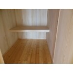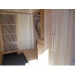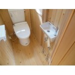 タンクに手洗い無しにしましたので、別途手洗いを設けました。 床は赤松無垢板、壁は珪藻土クロス。 収納棚も赤松(中身は桐)で統一しました。