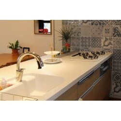 最終的にペニンシュラ型にしたのでコンロ脇の壁に工夫をしたいと思い、LIXILのエテルネというランダム柄のタイルを貼りデザイン性にもこだわりました。