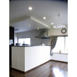 対面式キッチンがご希望との事で、現在の間取りで対面式キッチンが違和感なく納まる間取りを検討しました。 対面キッチンにした際に、「キッチンの生活感がお客様の目に触れないか気になる」というご意見をいただきましたので、開放感を損なわない程度キッチン前の壁を少し高く工事させていただきました。 床・壁・天井の内装リフォームと合わせて照明計画を行ったため、居心地がよくモダンな空間にリフォームできたと思います。 写真にはありませんが、リビングとキッチンダイニングスペースを間仕切るパーテーションや、各室のクロス工事もあわせて行っております。