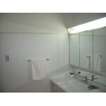 カラーガラスパーテーションで分けるホテルライクなサニタリー