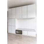 システムキッチンで収納増大、吊り戸収納を減らし壁際を有効活用