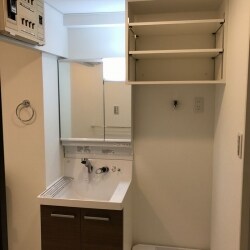 洗面化粧台の交換、サイズは既存と同じより大きいものがよいが、現状幅600以下のスペースに洗濯機置き場を作りたいので方法があれば提案をしてほしい。