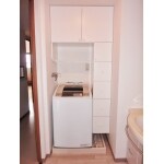洗濯機を寄せ、空いたスペースに合わせた収納棚を設置しました。 洗濯機上の吊戸では高くなっており、すぐに物が取り出せないので、横に収納棚を取り付けることでタオルや洗濯用品などをすぐ取り出せます。 お客様のご希望ではありませんが、片開き戸が廊下側に開き、危ないのでアウトセットの引戸にすることをご提案いたしました。 引戸にすることで廊下で衝突することなく、安全になりました。