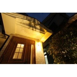 屋根の破風とドーマに凝ったつくりの外観を活かし、モダンな雰囲気から洋風な雰囲気に。埋め込み照明に照らされた植栽の影が軒天に映し出され、幻想的な雰囲気を演出。