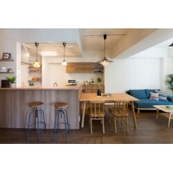 元和室の洋室や寝室にクローゼットを造作して、収納を確保しました。 既存の間取りを活かしつつ、カフェやバーのようなカウンター付きキッチンと、趣味の作品制作や教室が開催できるアトリエをプランしました。 積極的に暮らしを楽しむ若いご夫婦のライフスタイルを応援する、個性的な住まいに生まれ変わりました。
