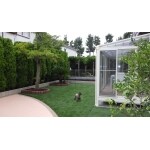 既存の木を残し、人工芝とタイルを敷き詰め、サンルームを造りました。 1畳ほどの菜園と、バーベキューコーナーも設けました。