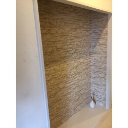 玄関と同じ、3Dクロスです。一般にクロスはビニールクロスを使います。3Dクロスは海外クロスで見た目もリアルで伸び縮みもなく丈夫で長持ちします。床の色と一体感があり、自然な仕上がりになりました。
