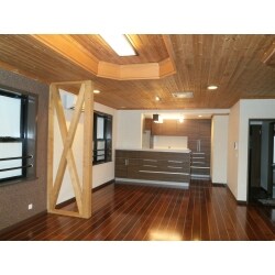織り上げ天井を造ることで、広リビングが広く感じます。 木目調がお好きということで、天井にも木を取り入れました。