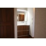 限られたスペースということで、洗面台は引き出しで収納力が良い仕様、洗面鏡台も三面鏡内に収納がある仕様にしました。 内装はそのままがご希望でしたので、既存のクロス跡が出ないように汚れに強いパネルを左右に施工しました。照明の配線跡は壁紙を再利用して補修しました。