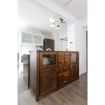 閉鎖的だったキッチンから、奥様待望の明るい対面キッチンへ。 床には年月で味わいが増す無垢フローリングにしました。 壁を取り除いて玄関からの動線を確保しました。 左側が水回りで、その先にはお母様の部屋になっているため動線も良いです。