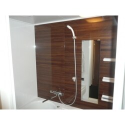 アクセントパネルに濃いめの木目をあしらったユニットバスを選定。
