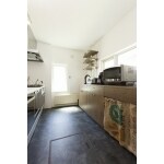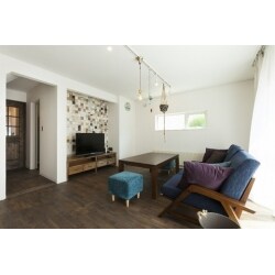 床材は、お選びいただいた古材モザイク柄の壁紙との相性もよい使い込まれた風合いの無垢フローリングを採用しました。 あえてダイニングセットを置かないことで広々としたリビングダイニングスペースになりました。