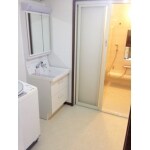 浴室のリフォームに伴って洗面化粧台の交換、手すりの取付、クロス工事、クッションフロアの張替を行いました。
