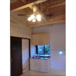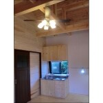 お客様が裁縫をされるということで、のびのびと裁縫できる空間を創りました。 「木のぬくもり」を大切に、天井・壁・床のすべてに杉材を使用。 掲示板には、コルクと杉を市松模様にして「あそび」も取り入れました。