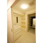 洗面化粧台が広く洗濯機が置けずに使い勝手の悪かった洗面室。 洗面室を広げることで、洗面化粧台と洗濯機を並べることが出来ました。 棚を作り、タオルや洗剤などを置くスペースも設けました。