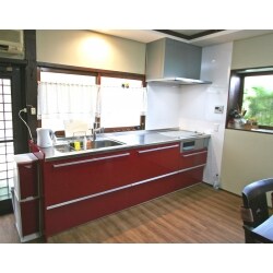 (旧東京ガスリモデリング株式会社での事例です。)キッチンの交換に伴い、L型からI型へレイアウトを変更しました。吊戸棚を無くしたので、流し元灯のかわりにダウンライトを設置して、よりスッキリとした空間にしました。また、既存の素敵な日本家屋の雰囲気をなるべく活かしたかったので、内装は残せるところは残すように致しました。日本風の家屋には漆のような赤がとても似合うので、キッチンの扉材に思いきった赤をご提案したところ、ご採用頂けました。赤いキッチンがアクセントとなる、広々とした素敵なキッチン・ダイニングになったのではないかと思います。