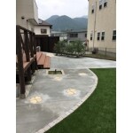 土間コンクリート部以外に防草シートを敷設し、人工芝と石灰石を敷設。 お子様達がユックリ遊べる広さの人工芝面積を確保し、BBQスペースとして火種等が落ちても安心な土間コンクリートを既存デッキ前に打設。 一部目隠しをご希望されてましたがデッキ最上段からを考慮しH2000の角度付スクリーンを設置。 モルタル塗り門塀が既存で設置されておりましたが、機能門柱への変更を希望され意匠性の高い物へ変更。 既存サンルーム横に勝手口があり、その上部へテラスを設置しサンルームと形状違いの為簡易連結。 和室窓からの景観として他の箇所では使用していない黒ミカゲのピンコロ石で枠を作り落ち着きのある花壇を作成しました。