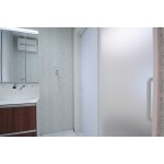ヒートショック対策に浴室暖房乾燥機。 広めの脱衣室から繋がる3枚引きの引き戸。