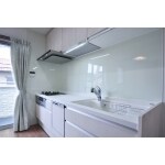 淡いグリーンのキッチンパネルとホワイトのキッチンの組み合わせ。