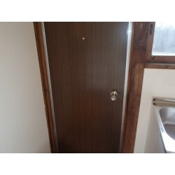 木製の玄関扉は防犯上もあまりお勧めできないので、アルミ製のフラッシュドアに変更しました。また、ドアスコープを設置して鍵も変更しています。扉の見た目は他の部屋と変わらないように木目調で仕上げています。 工期は、扉の制作期間も含めています。