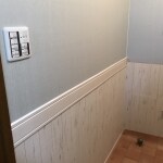 収納が引き出しになり収納量も増えました。 ミラーも三面鏡以外に手前に引き出せて使いやすくなりました。 クロスはヨーロピアンなイメージで貼分けを行い 腰壁風にボーダー板を貼りました。