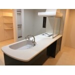 最初は違う商品をご提案したのですが、ショールームで気に入られたトクラス製の洗面化粧台を設置致しました。間取り変更にともない余裕がある空間になるように広めに洗面所のスペースをとり洗濯機置き場は入り口横に設置して余裕が持てるようにしました。